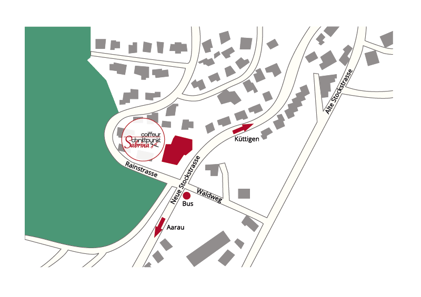 Die Bushaltestellen befindet sich gleich vor dem Center. 10 min entfernt vom Bahnhof Aarau.
